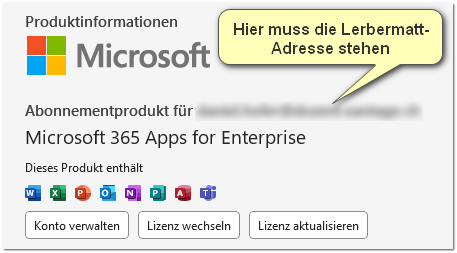 Vorab-Hinweis: wer gerade einen neuen Computer gekauft hat, muss in der Regel kein Office mehr installieren, sondern kann einfach mal Word starten. Bei der Frage nach der Lizenz muss man sich mit der E-Mail-Adresse der Lerbermatt anmelden. Unter Datei/Konto unbedingt kontrollieren, dass die Lerbermatt-Adresse hinterlegt ist: