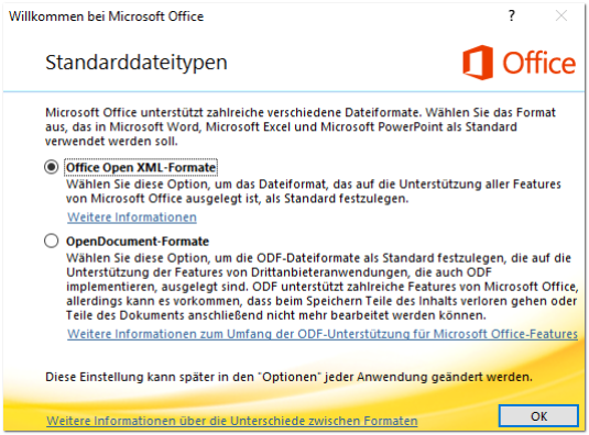 - Falls die folgende Frage erscheint, unbedingt «Office Open XML-Formate» auswählen und mit OK bestätigen:
